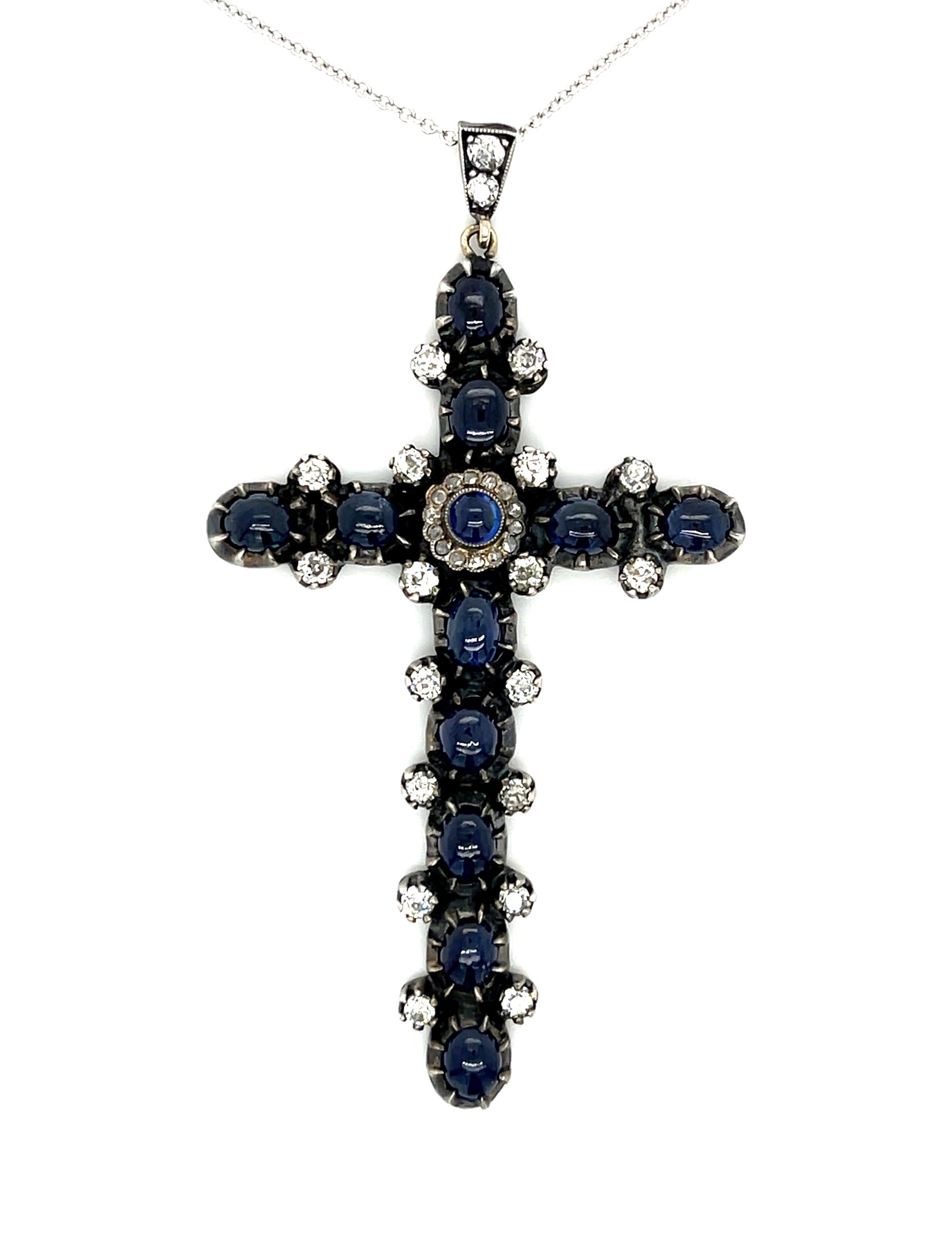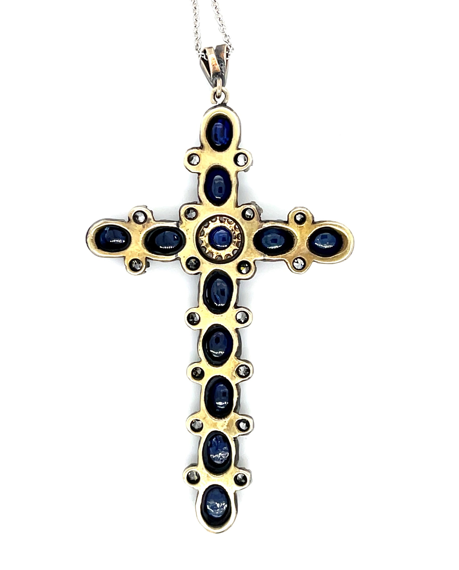 6.75ct Cabochon Sapphire Silver & 18KY Handmade Cross/Pendant 2.25ct Diamonds