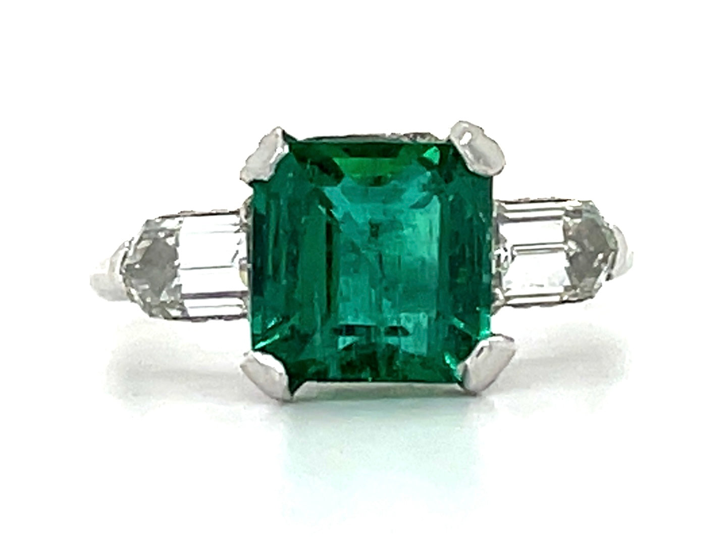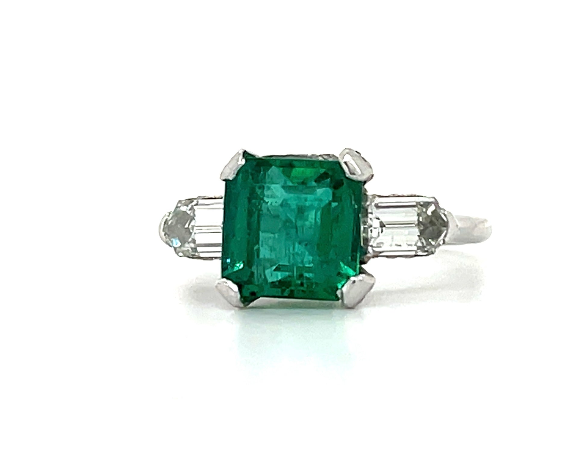 Art Deco 2.95ct Emerald Platinum Ring (Circa 1930s) .80ct Bullet Diamonds .34ct Side Diamonds