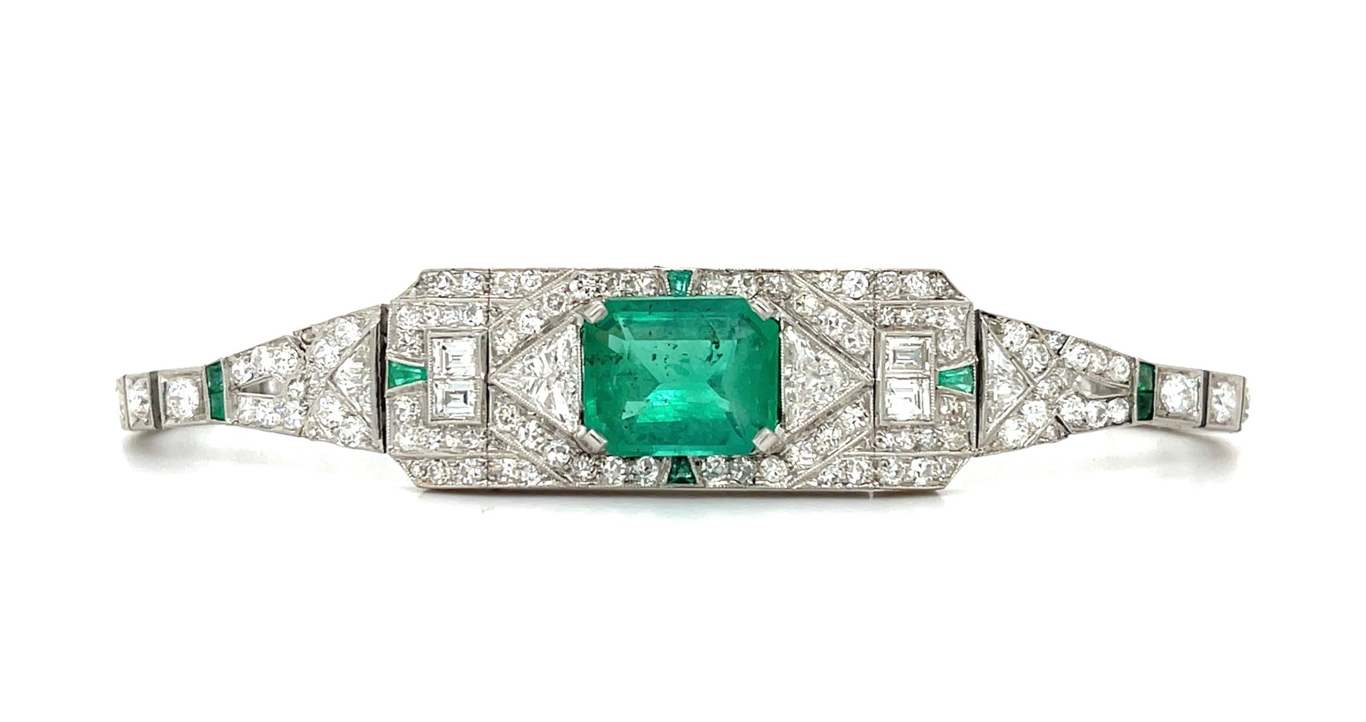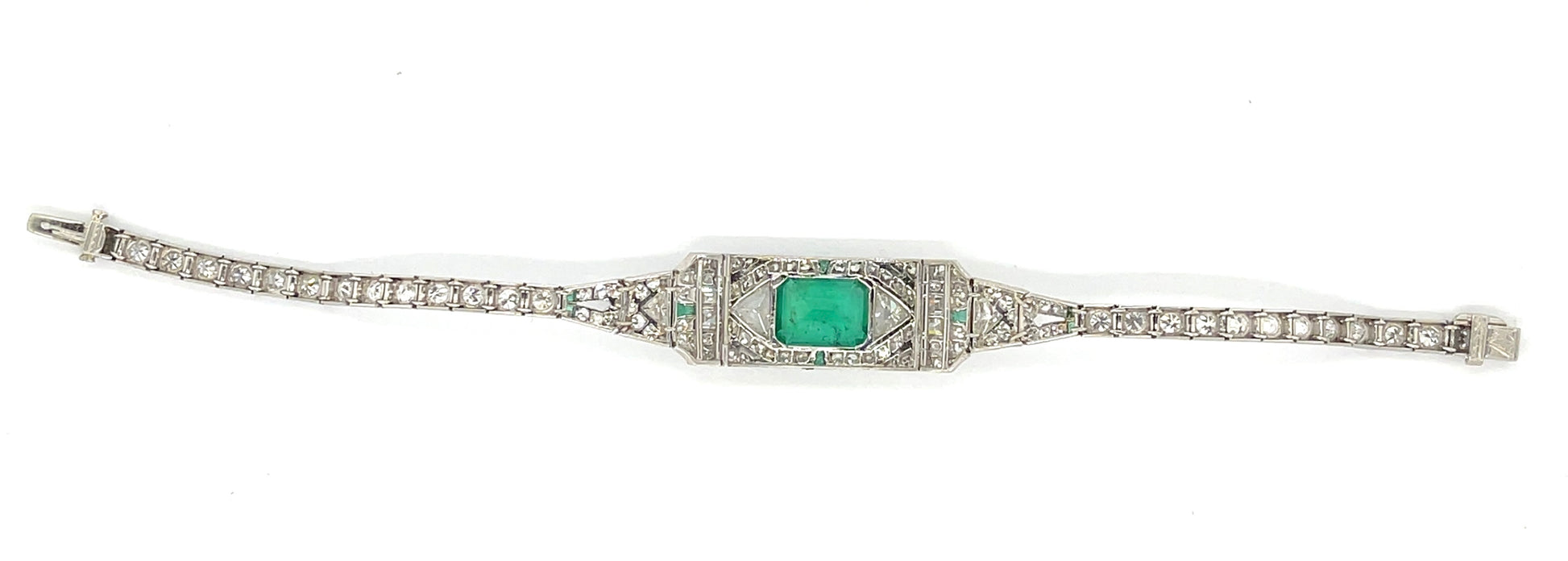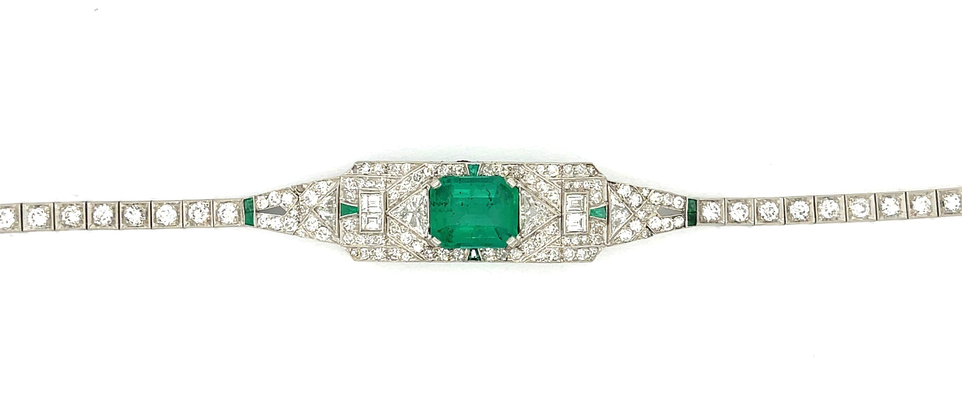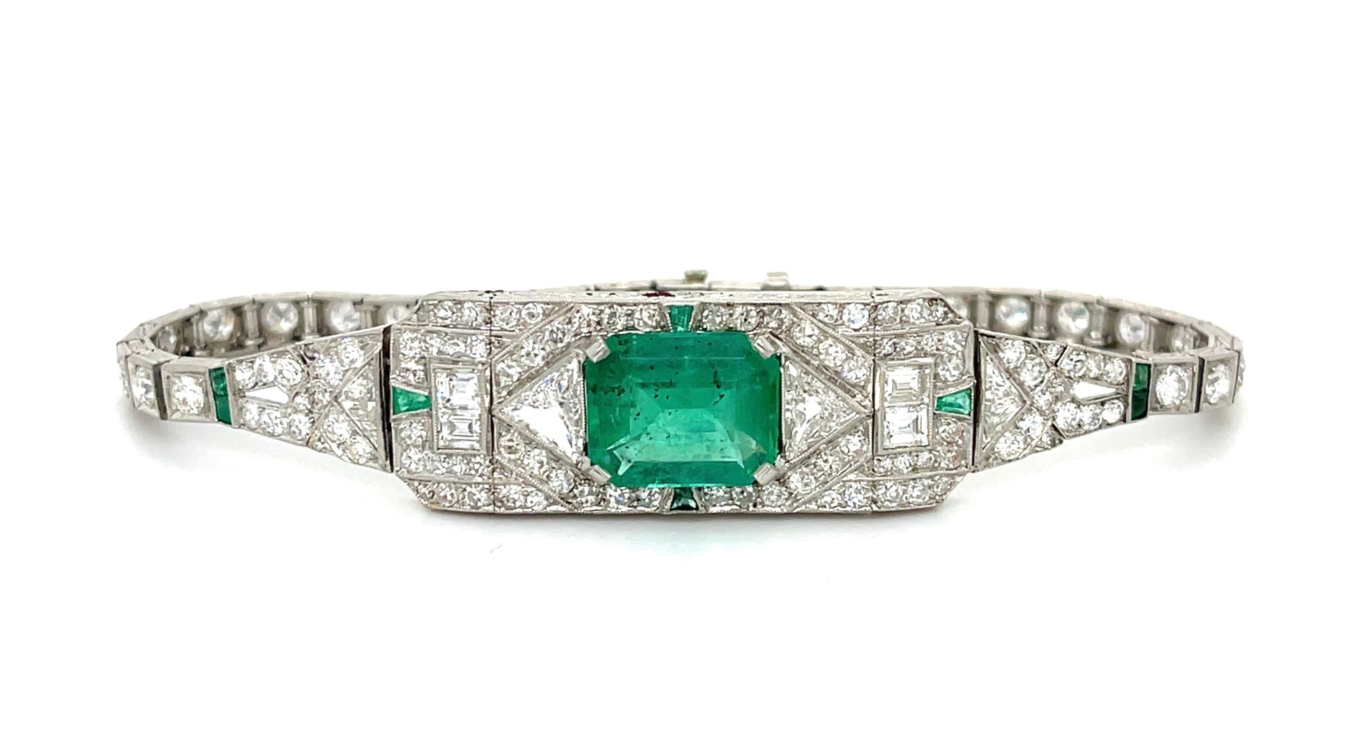 Art Deco 4.46ct Emerald Bracelet Platinum (Antique Circa 1920s) 5.75ct Diamonds (114 Stones)