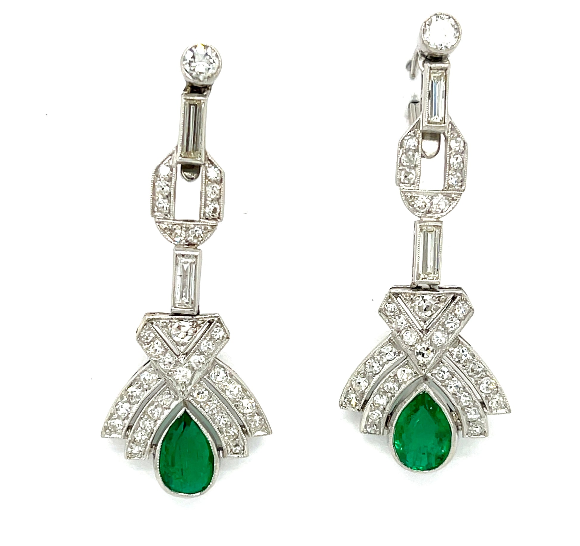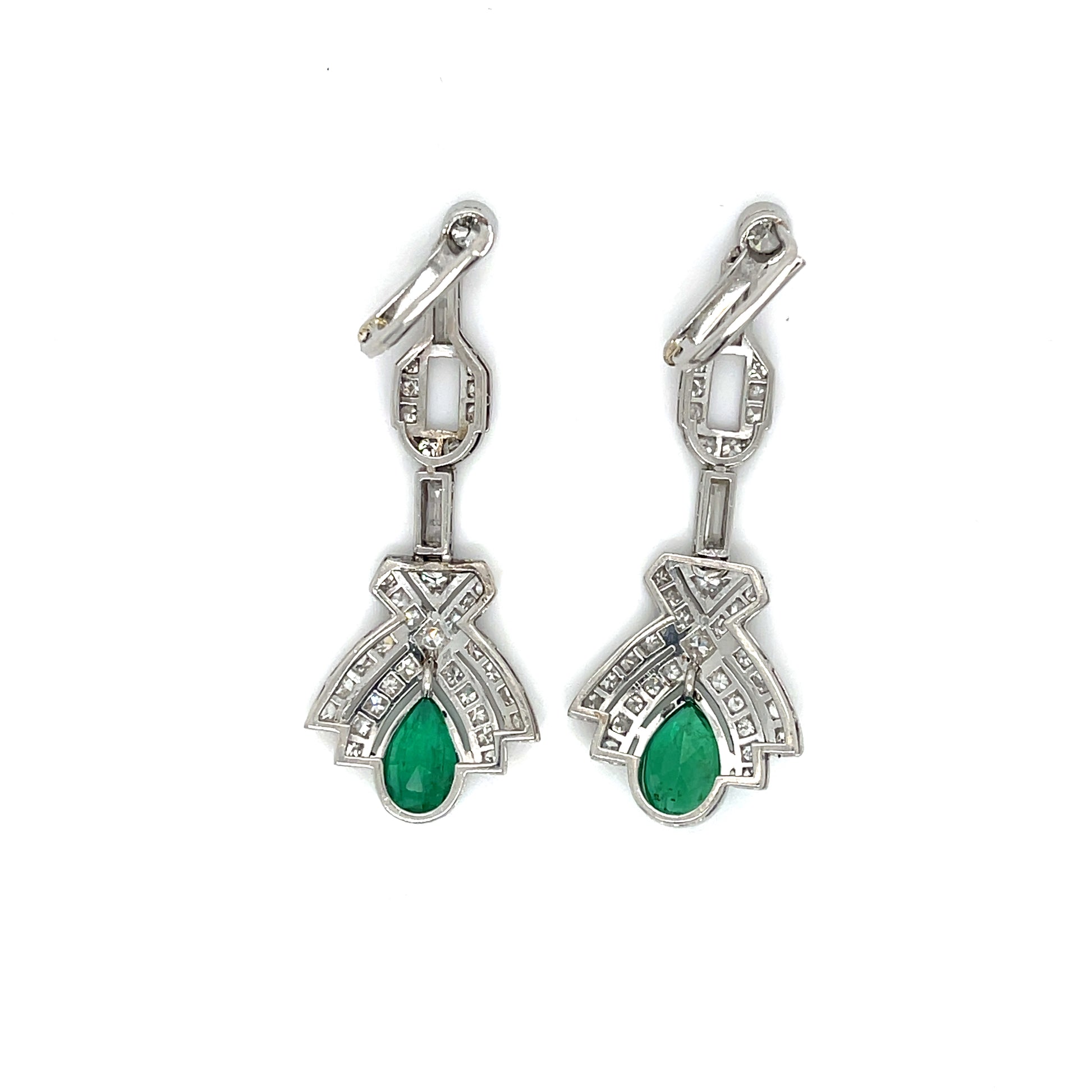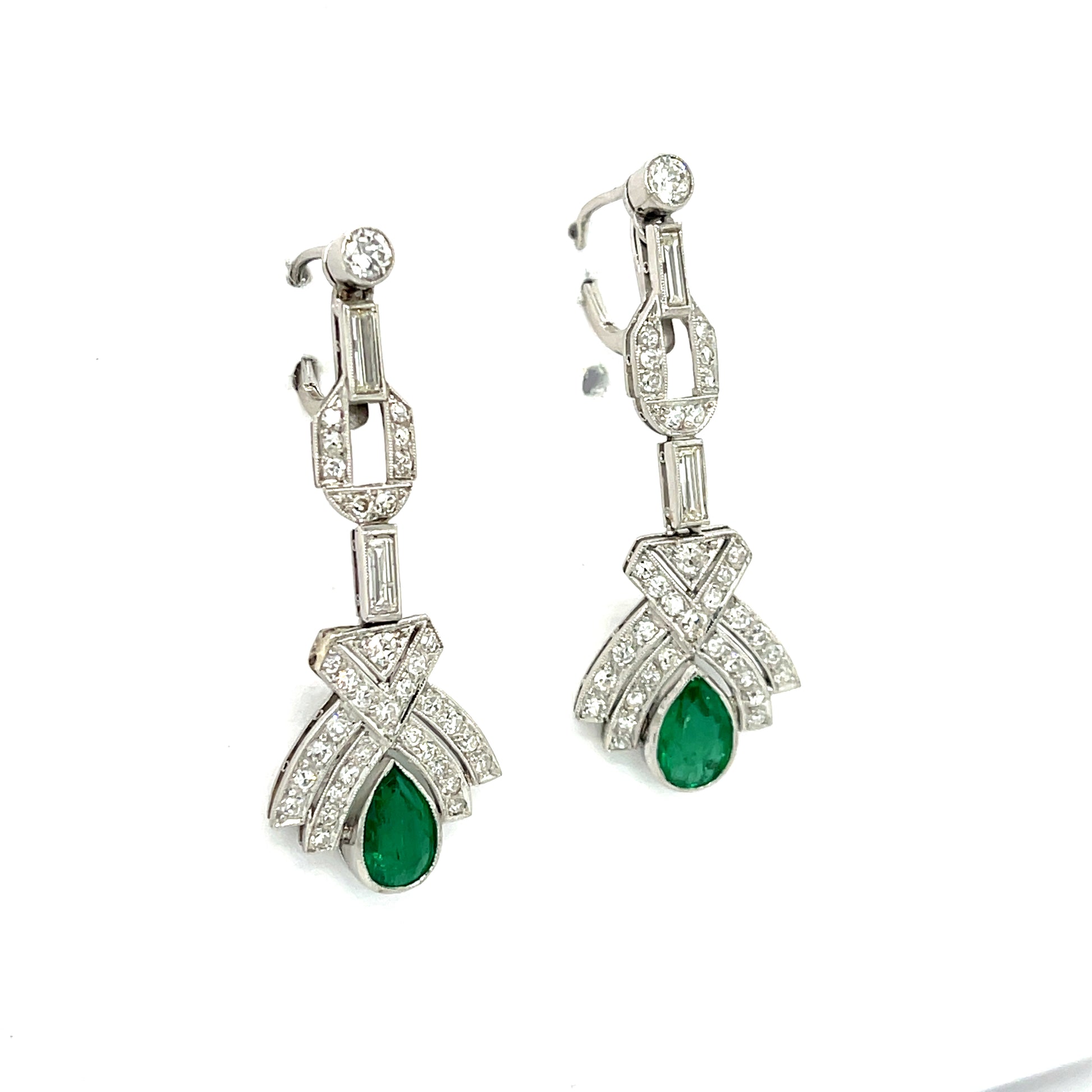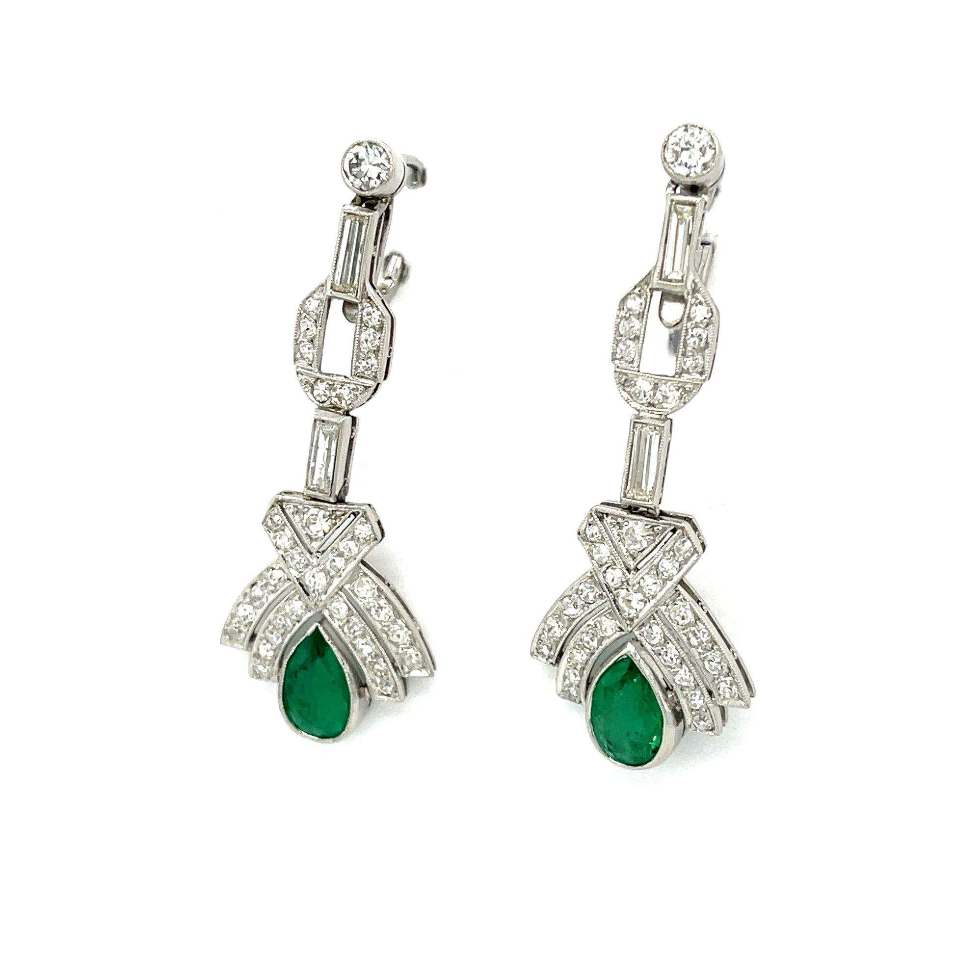 Art Deco (Circa 1930s) 3ct Pear Shaped Emeralds Vintage Platinum Earrings 4ct Diamonds