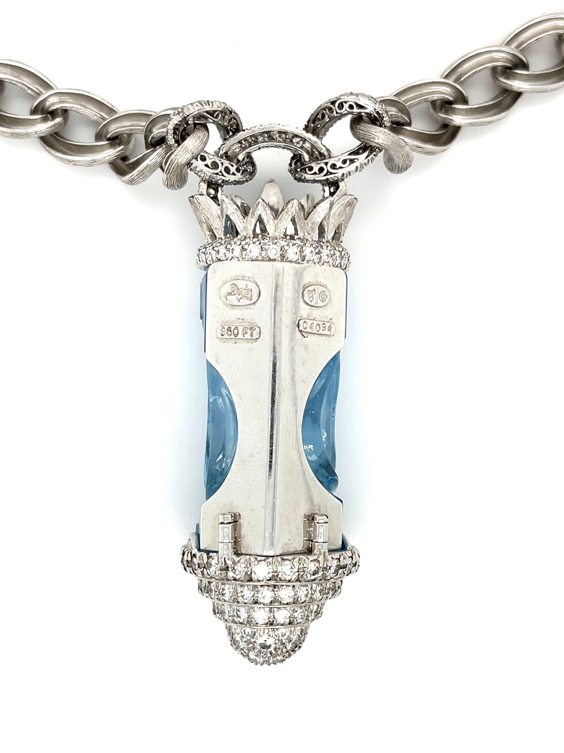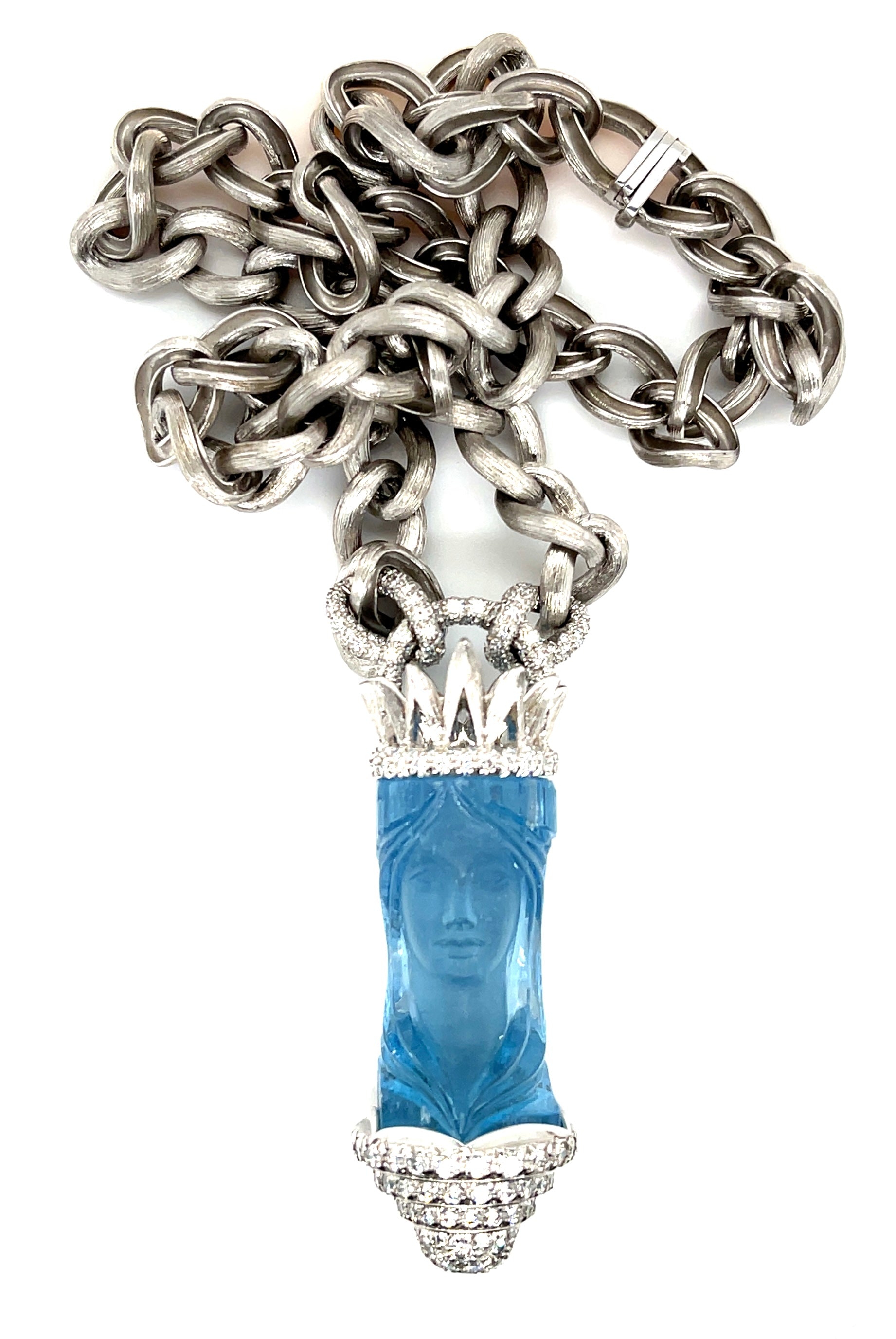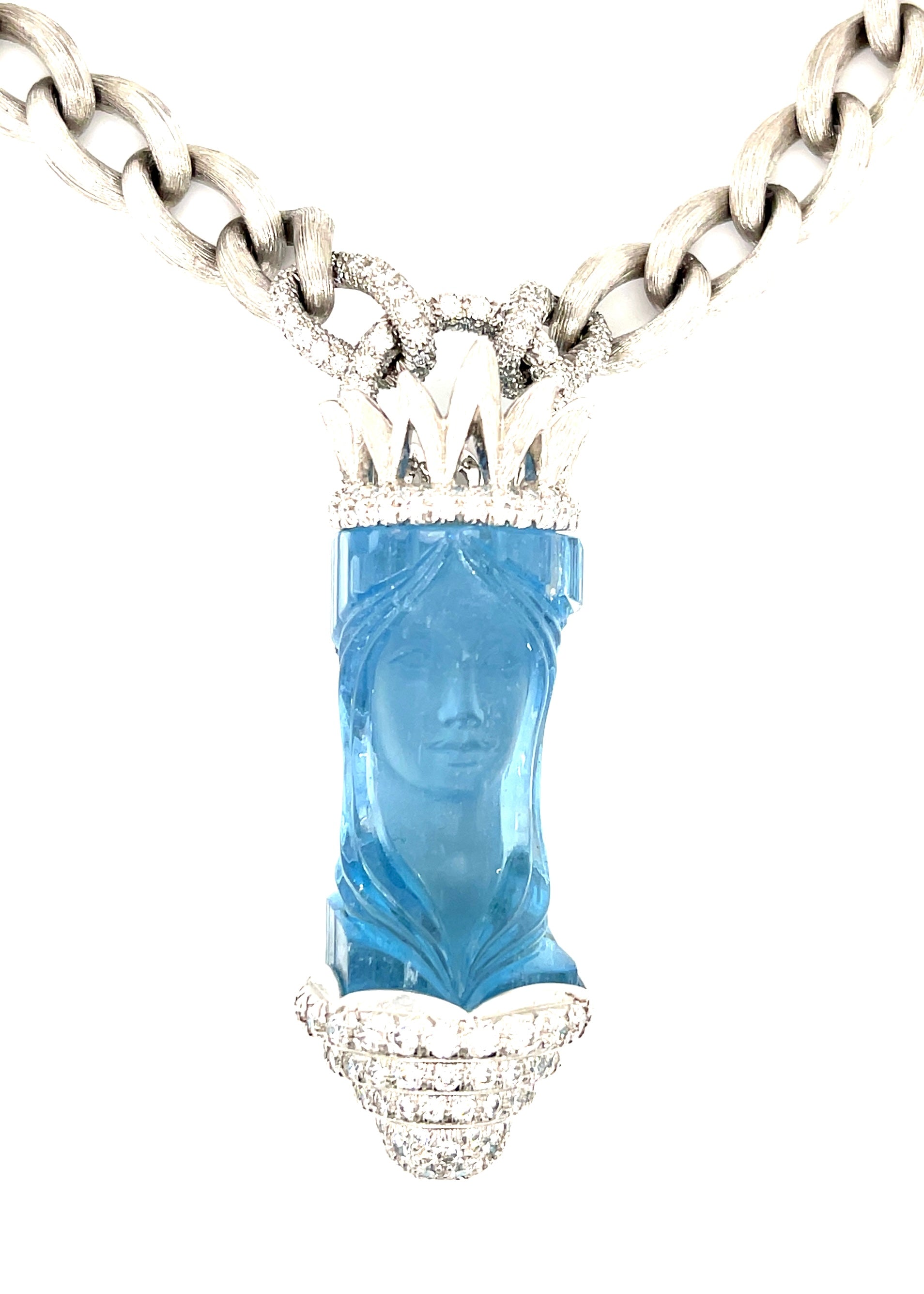 Henry Dunay 108ct Carved Female Aquamarine Pendant Set in Platinum+ Chain Link Metal Necklace