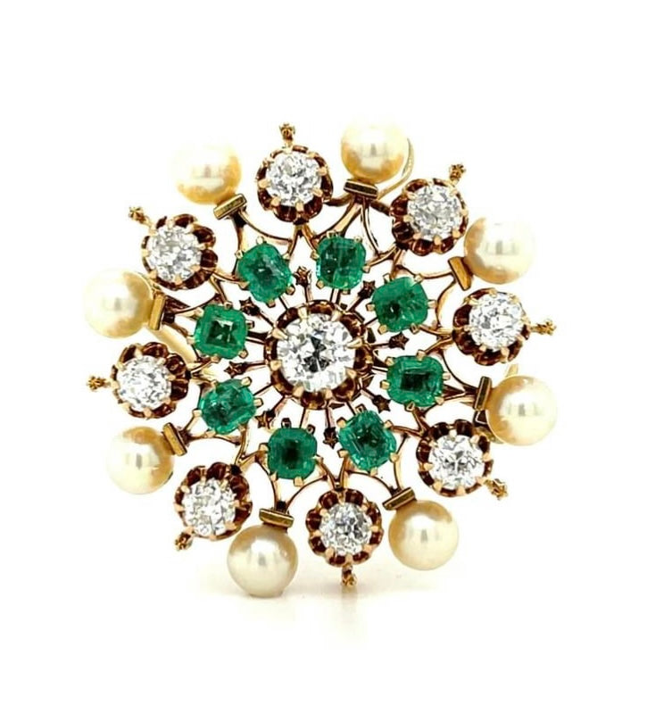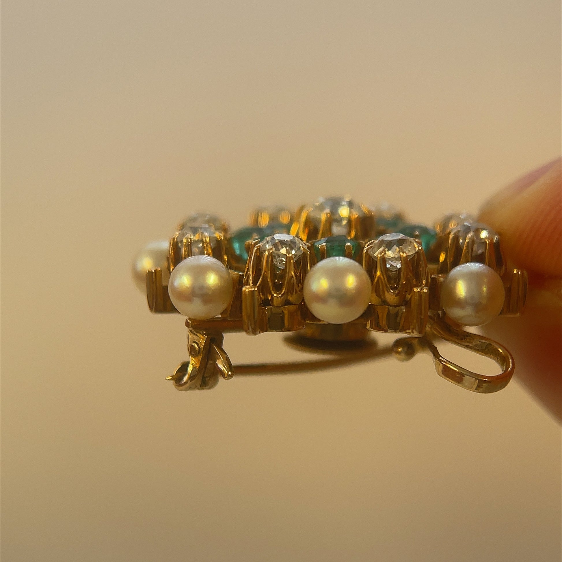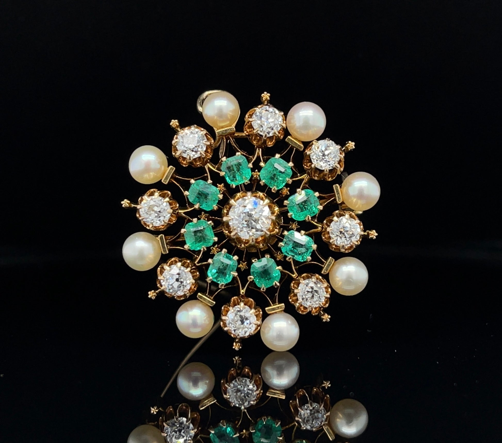 Victorian (Circa 1880s) 1.50ct Old European Cut Diamonds 1ct Emeralds & Natural Pearl 14KY Antique Pendant/Necklace